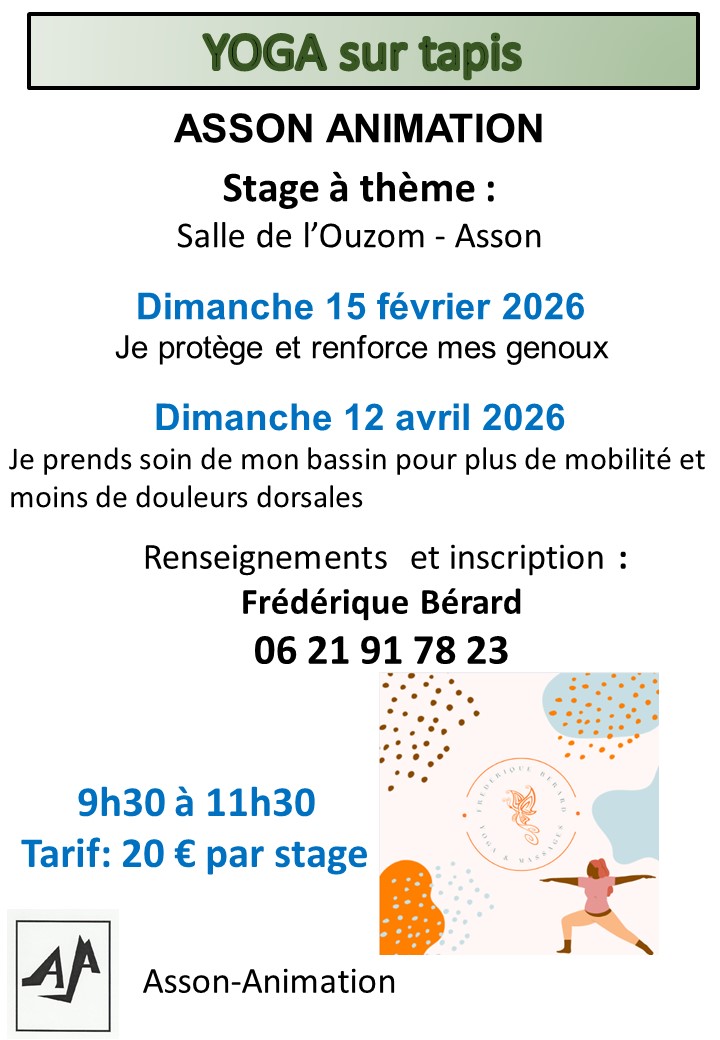 Ouvert à tous – Stage à thème – Salle de l’Ouzom – Asson Dimanche 15 février 2026 – 9h30 à 11h30 « Je protège et renforce mes genoux avec le[…]