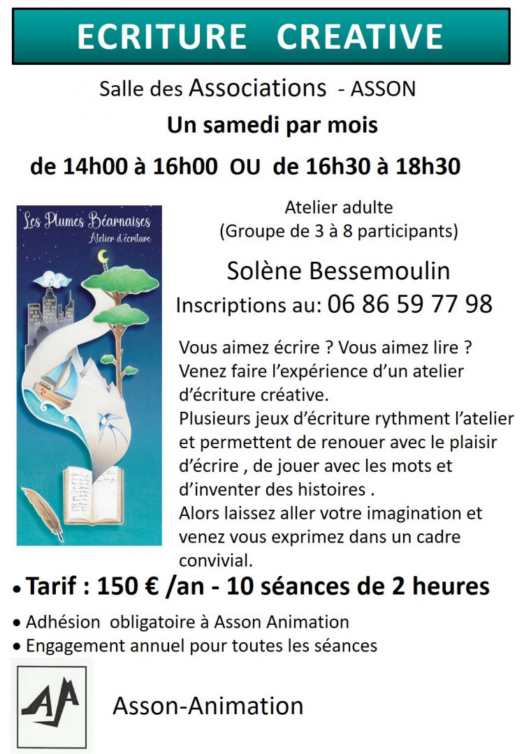 Un samedi par mois de 14h00 à 16h00 OU de 16h30 à 18h30 Seul ou entre amis, venez faire l’expérience d’un atelier d’écriture créative. Solène Bessemoulin vous proposera plusieurs jeux d’écriture (avec différents supports et thématiques), pour renouer avec le plaisir d’écrire, de jouer avec les mots. Alors laissez aller votre imagination et venez vous exprimer dans un cadre convivial ! Pour plus de renseignements: Contacter Solène Bessemoulin au 06 86 59 77 98 (http://www.lesplumesbearnaises.fr) L’écriture est un moyen de se retrouver, se rencontrer, s’amuser dans une démarche créative. Elle invite à l’imagination et au récit.