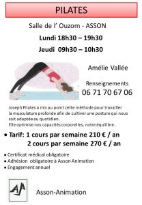 Tous les lundis et jeudis Joseph Pilates a mis au point cette méthode pour travailler la musculature profonde afin de cultiver une posture qui nous soit adaptée au quotidien. Elle optimise nos capacités corporelles, notre équilibre. Tarif : un cours 70 € par trimestre et 2 cours 90 € par trimestre Renseignements au 06.71.70.67.06 |