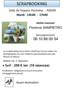 Atelier mensuel le Mardi de 14h00 à 17h00 Le scrapbooking est un loisir créatif qui met en valeur les photographies au sein d’albums personnalisés avec des dessins et décors. A l’heure du tout numérique, on pourrait penser que ces albums tombent en désuétude, mais au contraire, ils sont l’occasion de mettre en scène les souvenirs que l’on veut garder.